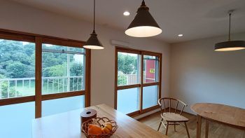 無機質なアルミサッシが目隠しされて、木の温もりとやさしい光に包まれた空間に。