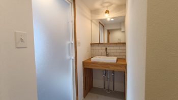 木のカウンターとシンプルなデザインのボウルの組み合わせが、清潔感の中にもぬくもりを感じる仕上がりです。
